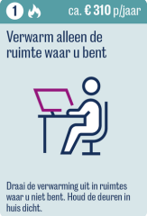 U bespaart bijvoorbeeld al heel wat door de thermostaat een graadje lager te zetten en alleen de ruimte te verwarmen waar u bent. Zet uw thermostaat ’s nachts, en wanneer u niet thuis bent, op 15 graden. Tochtstrips en radiatorfolie achter uw radiatoren voorkomen onnodig warmteverlies.