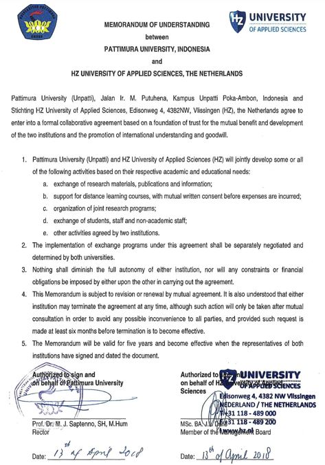 Op 13 april 2018 heeft een delegatie van de Pattimura Universiteit uit Ambon en de HZ University of Applied Sciences, de 'Memorandum of Understanding' ondertekend. Door deze overeenkomst komt een duurzame samenwerking tussen de beide onderwijsinstituten tot stand.