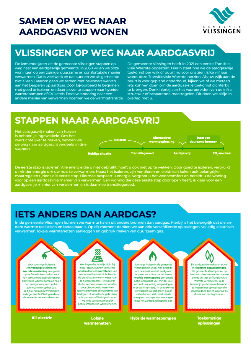 In de visie staat hoe we in de gemeente Vlissingen van het aardgas afgaan en hoe wij helpen om uw huis op een andere manier te verwarmen. Ook staat er in welke betaalbare en duurzame alternatieven er voor aardgas zijn.